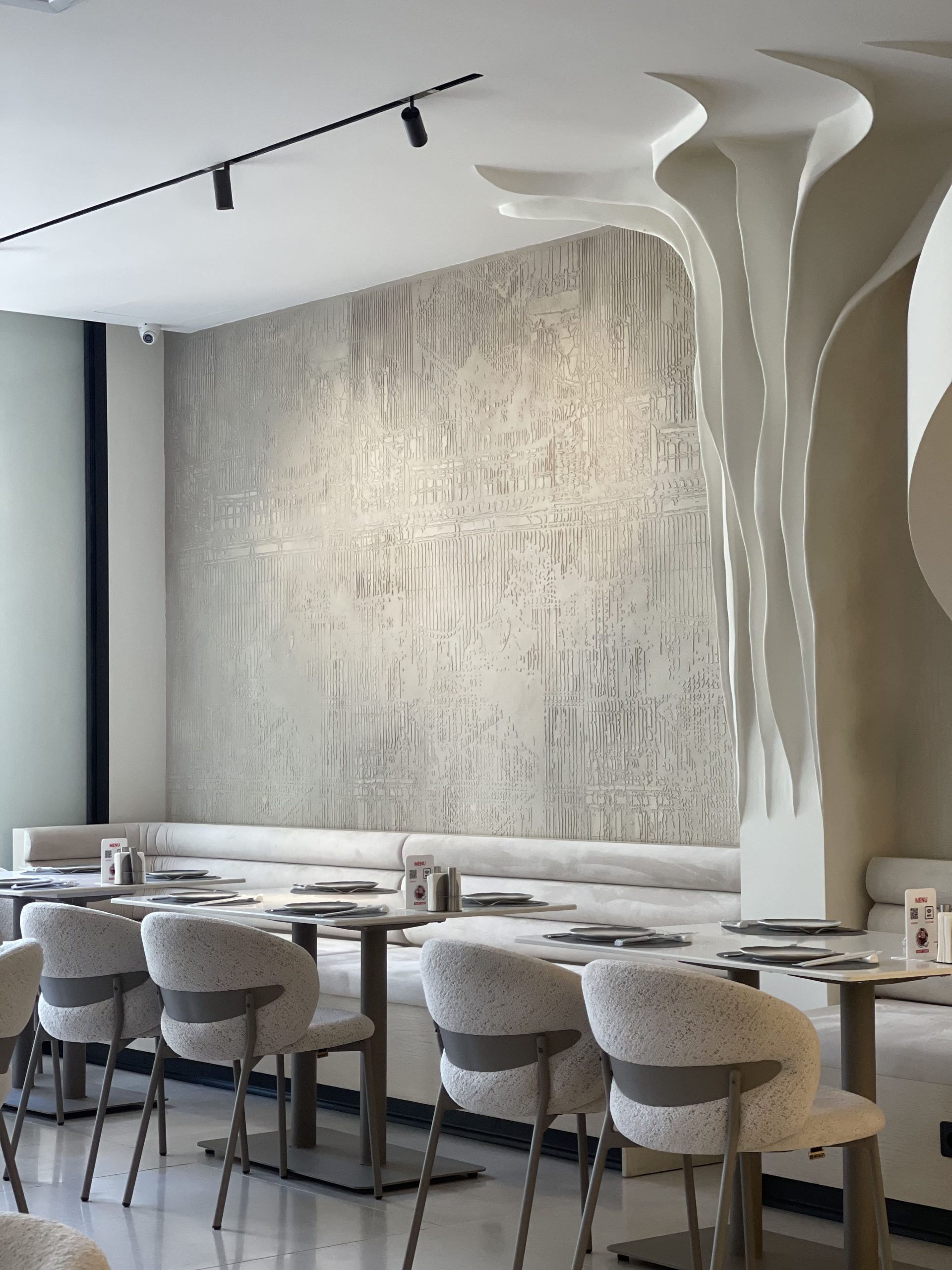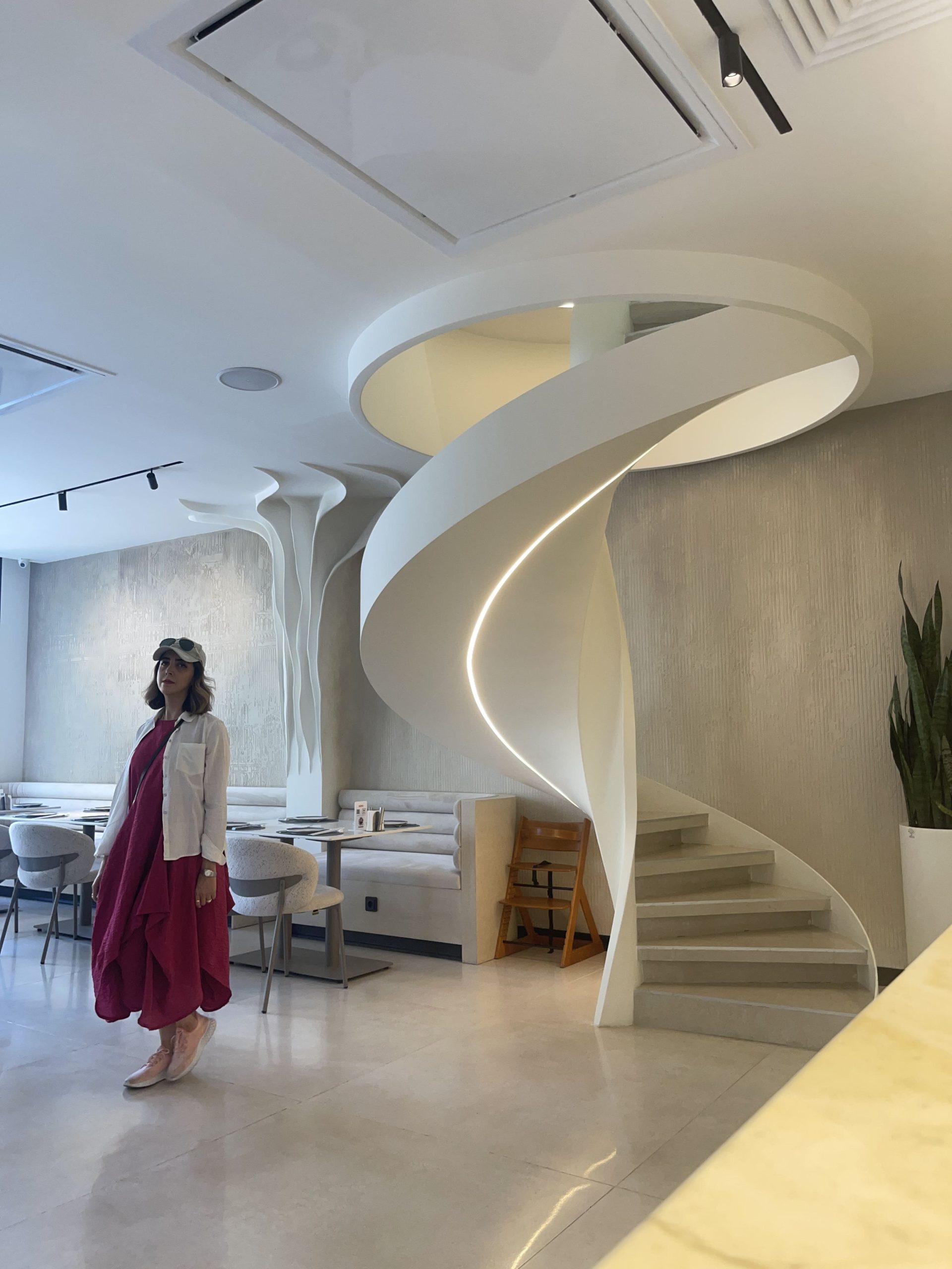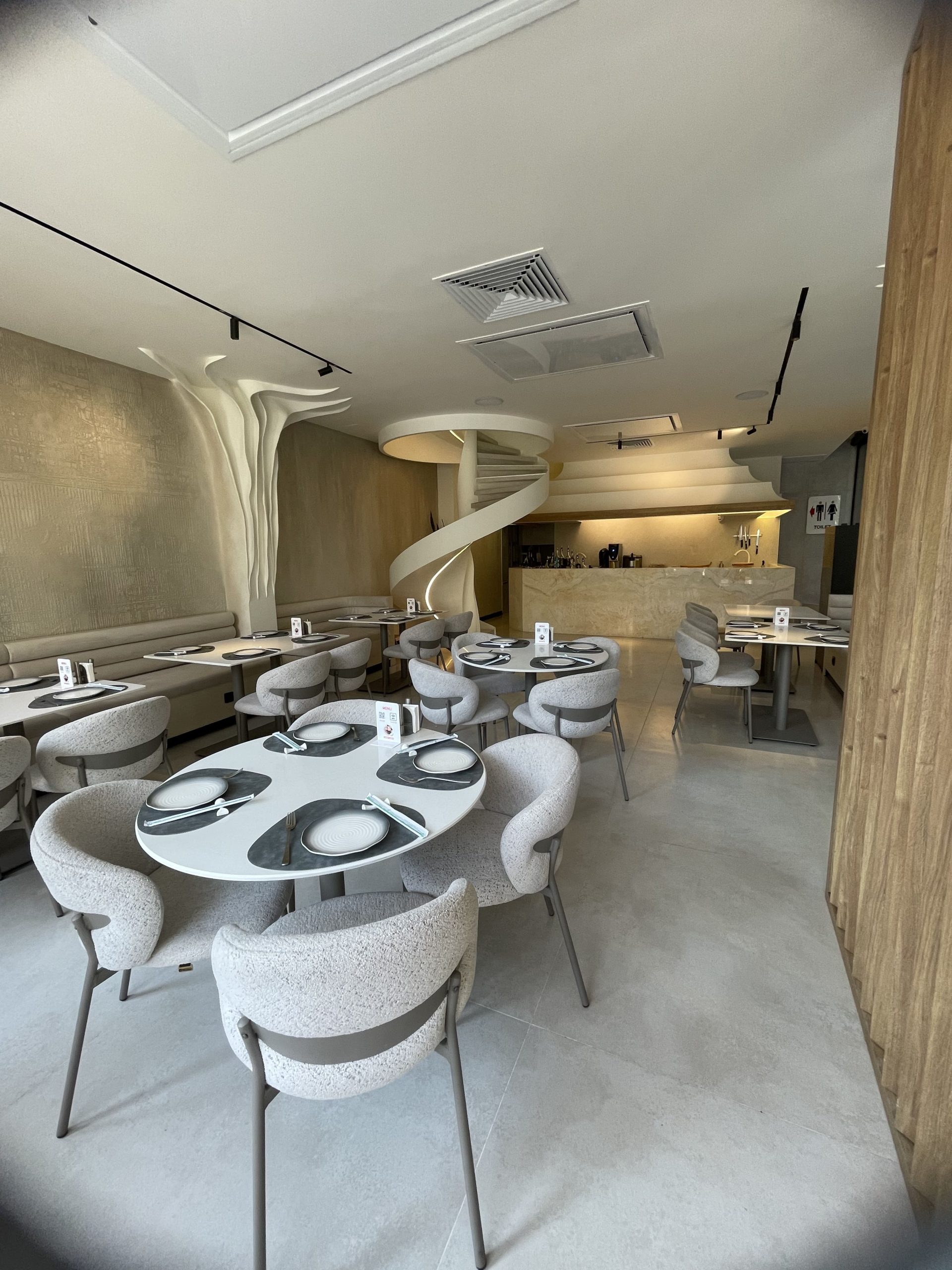 سبک مدرن و آرامبخش در عین حال الهام گرفته از المان های معماری آسیایی، فضای نشیمن تاتامی در طبقه دوم، ترکیبی از معماری مدرن و سبکی نو در عین ایجاد آرامش برای مخاطب حس فضای آسیایی را القا میکند. طبقه ی همکف فضای کانتر سوشی سقفی طراحی شده. ایده گرفته شده از معماری سقف های ژاپن و درختهای ژاپنی هست.